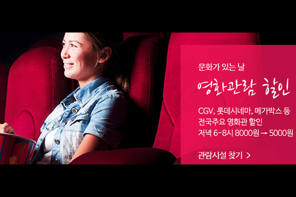 많은 사람들이 알고 있는 사실이기도 하지만, 아직 모르는 사람들도 많다. 매달 마지막 주 수요일은 문화의 날로, CGV, 롯데시네마, 메가박스 등 대부분 영화관에서 오후 6~8시에 시작하는 영화를 반값에 볼 수 있다. 단, 할인 혜택은 일반 상영 2D 영화에만 적용된다.