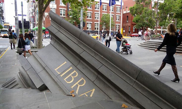 '주립도서관 밖에서 가라앉고 있는 건물(Sinking Building Outside State Library)'은 호주 멜버른에 위치한 조각으로, 마치 건물의 거의 모든 부분이 땅으로 가라앉고 마지막 한 코너만 고개를 내밀고 있는 모습이다. 이는 책의 무게가 도서관을 가라앉게 했다는 재치 있는 발상에서 비롯된 작품이다.