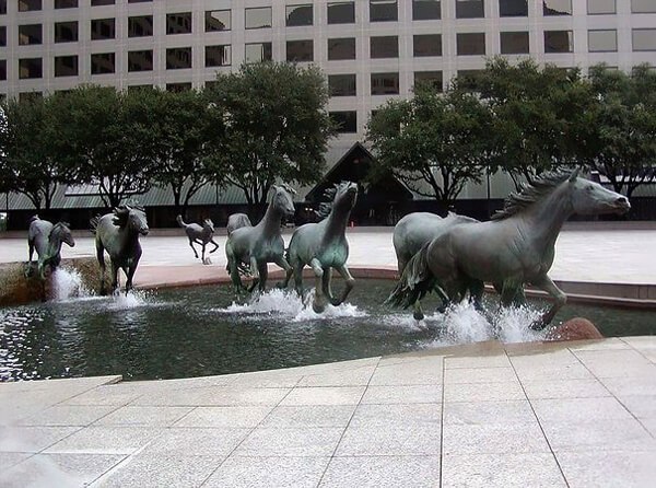 미국 텍사스에는 Robert Glen의 생동감 넘치는 조각인 '라스 콜리나스의 야생마들(Mustangs at Las Colinas)'이 있다. 말이 조각된 작품으로는 세상에서 가장 큰 규모를 자랑하는 이 조각은 텍사스에서 깊은 역사가 있는 서식 동물인 야생 무스탕을 기념하는 것이다. 짧은 냇물을 건너가는 말 한 마리 한 마리의 역동적인 모습과 자연스러움이 보여 오랫동안 감상할 수밖에 없는 작품이다.