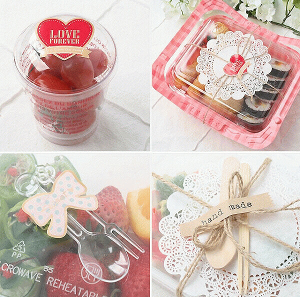 정성 들여 만든 도시락을 더욱 예쁘게 꾸며주는 소품까지 준비한다면 당신은 센스쟁이. 샌드위치를 담더라도 레터링이 들어간 유산지를 깔아주면 훨씬 고급스러워 보일 뿐만 아니라 깔끔한 뒤처리까지 가능하다. 그리고 다양한 디자인의 픽을 준비해 샌드위치나 과일, 소시지 등에 꽂아주면 비주얼도 화사해지고 꼬치로도 활용 가능하다는 점도 기억하자. 여기에 일회용 플라스틱 숟가락과 포크도 함께 준비하면 좋다.