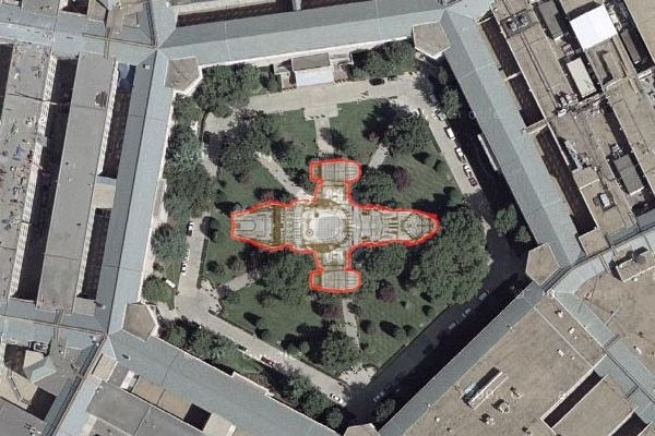 지하 2층부터 5층까지 있고 층마다 다섯 개의 링 복도가 있으며 건물 내 복도 길이를 모두 합하면 28Km에 이른다. 각 층의 면적은 14헥타르에 다다른다. 또한 131개의 층계와 7,754개의 창문이 있으며 41,492개의 콘크리트 말뚝 위에 지어졌다. 말뚝의 길이를 모두 더하면 322Km에 달한다.