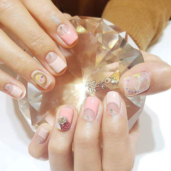 일반 살몬 핑크 느낌보다는 조금 더 페일한 컬러를 사용해 누드 톤의 느낌을 살려 표현한 디자인. 페일 살몬 핑크 컬러를 사용한 손톱에는 크리스탈 스톤과 진주 파츠를 이용해 좀 더 포인트를 줬다. 그리고 전체적으로 화사한 느낌을 더하기 위해 포인트가 되는 손톱에는 핑크 골드의 글리터 네일을 사용해 반짝임을 더 했다. 글리터 네일을 어떤 컬러로 사용하느냐에 따라서 전체적인 분위기도 달라질 수 있으니 미리 컬러가 주는 분위기에 대해 생각해 보는 것도 좋다.