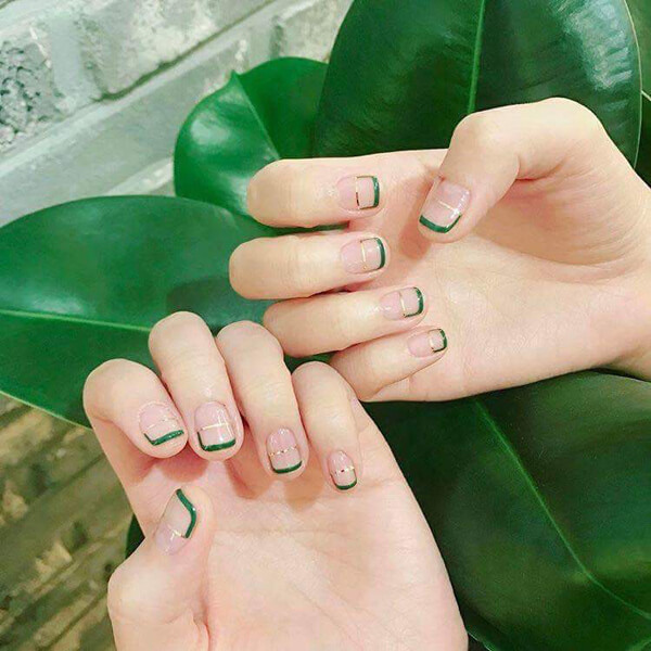 그리너리의 싱그러움을 가장 돋보이게 해 줄 시스루 네일. 손톱 본연의 누드 톤을 표현하면서 깔끔해 보이기 때문에 여전히 인기가 많은 디자인이다. 이 디자인에서는 먼저 스퀘어 라인으로 쉐입을 정리하고 엣지 부분만 그리너리 컬러로 포인트를 줬다. 그리고 프렌치 분위기가 나게끔 골드 라인 스티커로 디자인해 더욱 깔끔해 보이는 스타일로 완성했다. 특별한 포인트 없이 색상 그 자체만으로도 모던하고 우아한 느낌을 주는 디자인.
