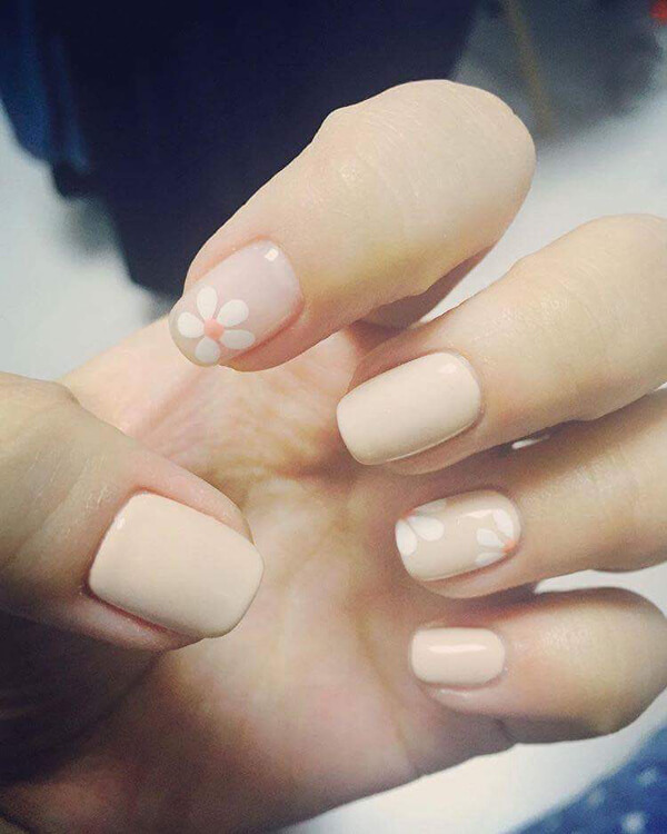 누드 톤의 가장 베이직한 컬러 중 하나인 아이보리. 특히 라이트 아이보리 계열을 사용하면 더욱 깨끗한 느낌이 난다. 대신 피부 톤이 어두운 사람에게는 대비 효과로 어두운 피부 톤이 더 강조될 수 있으니 참고하자. 깔끔하게 정돈된 손톱에 누드 아이보리 컬러를 풀코트로 바르고 포인트가 되는 손톱에는 좀 더 밀키한 느낌의 아이보리 컬러를 사용해 콕 찍은 듯한 플라워 무늬를 더욱 돋보이게 했다.