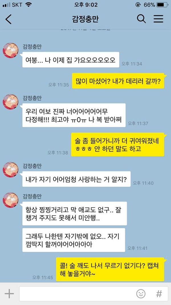 보통 연인 사이에 많이 발견 할 수 있는 모습으로 애정을 표현하거나, 속상했던 마음을 이야기하거나 둘 중 하나로 좁혀지는 유형이다. 보통 이런 유형은 평소 수면 바로 아래에 들썩이던 감정이 술로 인해 봇물 터지듯 쏟아지게 되는 것. 카톡을 받는 입장에선 급격히 애교가 많아진 상대방의 모습에 저절로 엄마 미소가 피어오를 수도 있다.