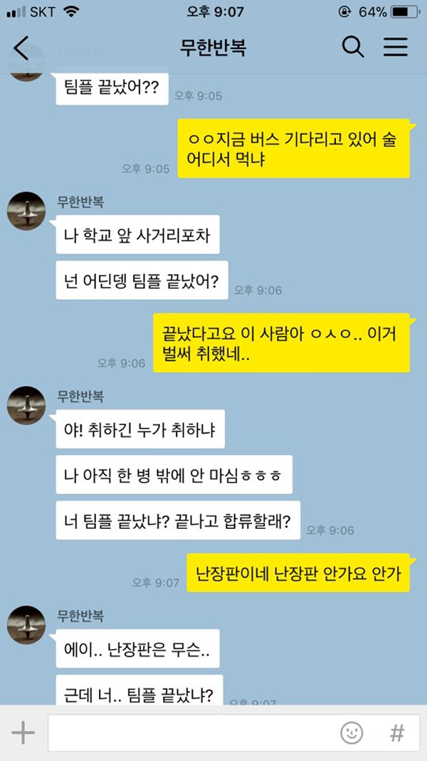 했던 말 또 하고, 했던 말 또 하고. 실제로 만나서 하는 주사였다면 뭐 그러려니 할 텐데, 바로 위에 보낸 카톡도 발견하지 못 하고 똑같은 말을 보내니! 어이가 없어서 웃음이 나오기도 한다. 카톡에서 제대로 술 냄새가 나는 유형으로 더 이상 답장하지 않는 것만이 이 도돌이표에서 빠져 나갈 수 있는 방법이다.