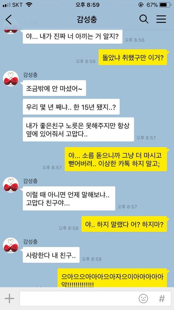 알딸딸하게 술기운도 올라 왔으니, 꽁꽁 숨겨 두었던 말을 꺼내볼까? 평소에는 입 밖에도 꺼내지 않았던 말들을 아련하게 쏟아내는 유형들이다. 보이는 것은 카톡창 뿐인데 얼굴이 빨개지는 것 왜 일까? 때에 따라서 회포를 풀거나 진심을 확인 할 수 있는 기회가 되기도 하지만 닭살이 돋는 건 어쩔 수가 없다. 보낼 때는 그렇다 쳐도 다음날 뒷감당을 어떻게 하려고 이렇게 줄줄 이야기 하는지. 술의 힘은 역시나 강력하다는 것을 보여주는 유형.