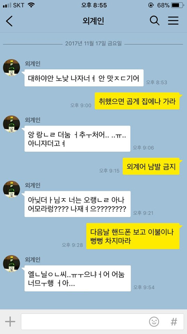 혀가 꼬인 만큼 손가락도 꼬였나 보다. 보내는 카톡마다 도대체 제대로 된 철자를 찾아보기가 힘든 유형. 짧은 문장에도 여러 개의 오타가 나는 모습을 보고 있자니 틀림없이 만취인 것이 분명하다. 정작 보내는 당사자는 제대로 쳤다고 생각하겠지만 카톡방에 올라오는 카톡들은 오타천지. 외계어를 남발하는 이들, 핸드폰을 잃어버리지 않고 카톡을 보냈다는 것 자체가 다행일지도 모른다.