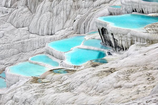 터키어로 ‘목화의 성’을 뜻하는 곳으로 석회성분이 다량으로 함유된 온천수가 수 세기 동안 바위 위를 흐르며 하얀 목화로 만든 성을 연상시켜 붙여진 이름이다. 터키 현지인들이 아름다움을 비유할 때에도 파묵칼레가 종종 등장할 정도로 경사면을 흐르는 온천수가 경관을 이룬다. 석회층은 하루에도 여러 차례 색이 변하는 것이 특징인데 푸르던 물은 희게 변색되고, 해질녘에는 붉은 빛을 띠게 된다. 때문에 세계에서 드문 색감 있는 온천으로 많은 여행들에게 사랑받고 있는 힐링 여행지이다.