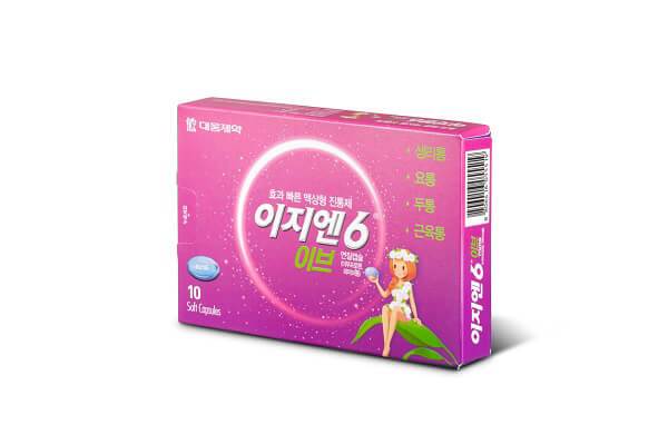 복합진통제로 불리는 이지엔6는 애니, 프로, 이브, 스트롱의 4가지 시리즈로 이루어져 있다. 가장 기본이 되는 이지엔6 애니는 소염, 진통효과를 가지고 있으며 이지엔6 프로는 덱시부프로펜을 함유했기 때문에 식사를 한 후에 복용하는 것이 위장에 좋다. 이지엔6 시리즈 중 생리통 진통제로 가장 많은 사랑을 받는 제품은 이지엔6 이브로 생리 전 부종을 완화시키고 골반이나 유방에 드는 둔중감을 해소하는데 효과가 있다. 타 진통제들과 성분은 동일하지만 액상형 연질캡슐이기 때문에 흡수가 빠르다는 것이 이지엔6의 가장 큰 장점. 따라서 빠르게 진정효과를 얻고 싶은 이들에게 추천하는 진통제이다.
