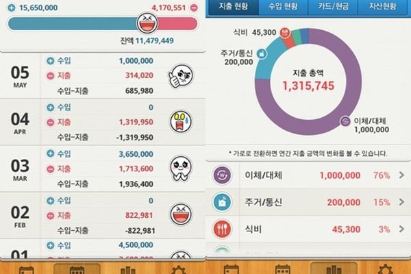 수기로 적는 가계부에 익숙지 않다면 간단하게 이분법으로 수입과 지출만 적어도 되고, 탁상용 달력에 지출 내역을 단순하게 기입해도 된다. 형식은 그다지 중요하지 않기 때문이다. 특히 요즘에는 무료로 배포되는 가계부 어플이 많아 유용하게 쓸 수 있다. 각 신용카드의 사용 합산 금액까지 자동으로 계산하는 기능도 있고, 그래프를 통해 자산을 비교 분석할 수 있는 기능도 있다. 어떤 것이든 가장 편한 방법을 선택하면 되는 것이다.