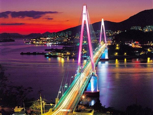 동양의 나폴리라고 불리는 통영. 그 중에서도 통영의 밤을 밝히는 통영대교의 야경은 아름다운 장관을 만들어 내며 많은 이들의 발길을 사로잡고 있다. 통영운하를 가로질러 통영과 미륵도를 연결해주는 통영대교는 작년 LED 경관 조명으로 바뀌면서 더욱 더 아름다운 야경을 선보이고 있다. 형형색색 다양한 조명들로 통영의 밤을 책임지는 통영대교는 통영여행에서 빠질 수 없는 필수코스. 아치트러스 공법을 이용해 만들어진 통영대교는 심플하지만 깔끔한 디자인이 포인트로 업그레이드된 야경까지 더해져 통영의 명물로 자리 잡았다.