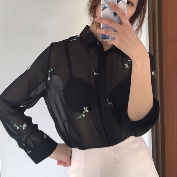 시스루 소재를 이용한 패션이 처음 등장했을 때는 ‘야하다’라는 느낌이 강했지만, 이제는 다양한 시스루 소재의 옷이 하나의 트렌드로 완벽하게 자리매김했다. 특히 여성스러운 섹시함을 강조하는데 더할 나위 없이 좋은 시스루 블라우스는 어떤 이너웨어를 어떻게 입느냐에 따라 가지각색의 분위기를 연출할 수 있다. 속옷만 착용한다면 좀 더 과감한 룩으로, 슬립을 매치하면 은근히 섹시한 분위기를 낼 수 있다. 시스루 블라우스를 선택할 때는 섹시함을 배가시키는 블랙 컬러를 선택하는 것도 좋은 방법이다.