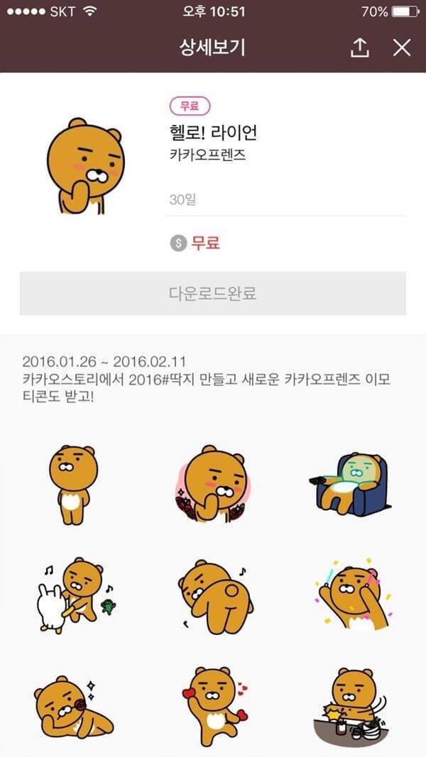 지난 1월 출시된 라이언은 이 회사 캐릭터 중 가장 인기가 많다. 매출 비중이 높아 카카오 직원들 사이에서 '라 상무님'으로 불린다. 첫 선을 보일 때 ‘헬로! 라이언’으로 출발해 두 달간 최다판매를 기록했다. 10개월이 지난 후에도 판매량 5위권 안에 들 정도다. 온라인 뿐 아니라 라이언을 활용한 인형과 쿠션, 파우치, 휴대폰케이스 등 오프라인 실물상품도 인기다.