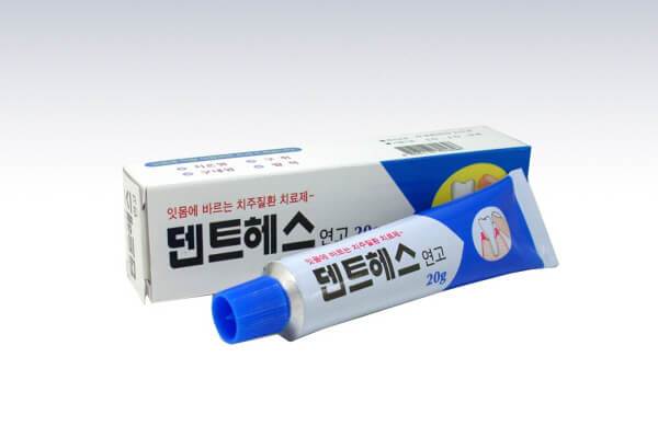 동구제약이 일본 Lion사와 기술 제휴를 통해 생산하고 있는 구내염 치료제 덴트헤스연고는 잇몸치료제 일본판매 1위 제품으로, 치은염, 구내염, 구취, 발적에 바르는 잇몸 치료제다. 상쾌한 민트 향으로 사용감이 좋고, 물로 씻어낼 필요가 없는 바르는 치료제로, 글리디실잔산디칼륨, 알란토인, 히노키치올, 염화세틸피리디움을 주 성분으로 한다.