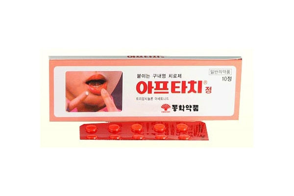 하얀 정제 타입의 구내염 치료제 아프타치는 성분은 오라메디와 같지만 제형이 다르다. 동그랗고 납작한 알약을 환부에 꾹 눌러 붙이면 알약이 점막에 달라붙어 서서히 약물이 침투되도록 고안된 구내염 치료제다. 아프타치 사용 시에는 환부의 침을 가제나 솜으로 잘 닦아 내고 발라 주어야 하는데, 침이 묻어 있는 경우 약이 잘 붙지 않고 떨어질 수 있다.