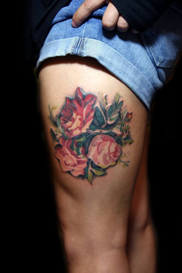 여성들이 했을 때 섹시한 매력이 가득한 곳이다. 심플하게 레터링으로 연출하거나, 레터링만으로 허전하다면 화려한 꽃을 달아서 연출해도 좋다. 허벅지는 다른 부위에 살이 많은 부분이어서 타투를 할 때 고통이 적은 편이지만, 허벅지 안쪽은 살이 연해 아프다고 하니 허벅지 타투를 할 생각이라면 미리 마음의 준비를 하도록 하자.