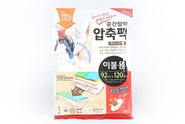 두꺼운 이불이 차지하고 있는 공간을 1/4로 줄여줄 수 있는 이불용 압축팩이다. 특히 집 안에서 많은 자리를 차지하고 있는 겨울용 이불에 해주면 효과적이다. 압축팩에 이불을 접어서 넣고 입구를 닫아준 뒤, 진공청소기를 이용해 압축해주면 이불이 1/4 크기로 줄어든다. 압축팩에 보관했던 내용물을 꺼낼 때에는 압축팩의 입구를 활짝 열고 양손을 이용해 내용물을 꺼내면 된다.
