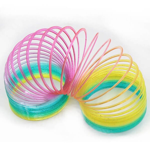 무지개 스프링은 딱히 기능이 없었음에도 어느 집이나 하나씩은 갖고 있었던 장난감이다. 말 그대로 얇은 링들이 차곡차곡 쌓여 있는 스프링인데, 무지갯빛으로 색이 다채롭게 새겨져 있다. 쭉 늘려보면 한없이 늘어나는 게 신기하기도 하고, 계단에서 스프링을 굴리면 차곡차곡 내려가는 모습 때문에 인기가 좋았다.