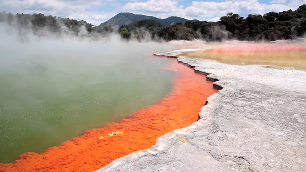 뉴질랜드의 '악마의 목욕탕' 역시 '샴페인 풀'와 같은 온천 지대에 있는 곳이다. '악마의 목욕탕'이라는 독특한 이름이 붙여진 이 온천은 수심 6m에 95도가 넘는 유황이 끓는 곳으로, 독특한 초록빛을 머금고 있다. 마치 팔레트에 물감을 풀어놓은 것 같은 신비로운 모습에 넋을 잃고 바라보게 되는 곳이라고.