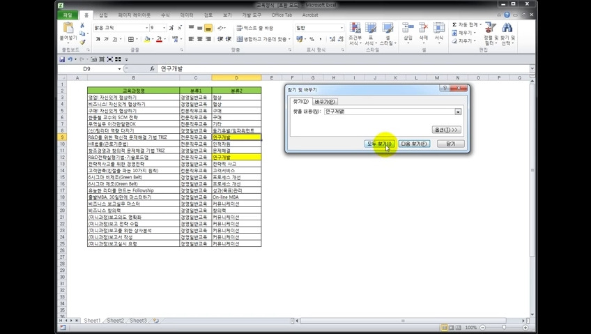 엑셀에서 자신이 원하는 내용을 찾고자 할 때는 단축키 Ctrl+F를 클릭하면 되고, 찾은 내용의 특정 내용을 바꾸기를 원할 때에는 Ctrl+H를 클릭하면 된다. 예를 들어 찾기 내용에서 나비를 검색해 참새라는 단어로 바꿔주는 기능을 한다. 찾기와 바꾸기는 엑셀 많이 사용되는 기능이기 때문에 외워두는 것이 좋다.