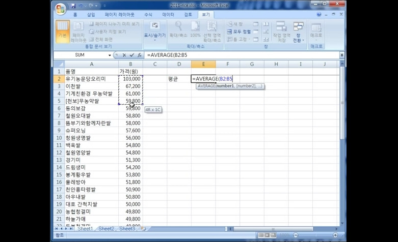평균을 구하는 함수는 AVERAGE이며, 셀에는 ‘=AVERAGE()’를 쓴 다음 괄호 안에는 평균을 구하려고 하는 셀의 번호를 넣어주면 된다. 조금 더 손쉽게 하려면 엑셀 화면 상단에 보이는 ‘자동합계’ 버튼 바로 오른쪽에 있는 화살표를 클릭해 ‘평균’을 클릭하거나, ‘수식’ 탭으로 넘어가 자동합계 글자를 누르면 나오는 평균 탭을 클릭해서 평균을 구하는 방법도 있다.