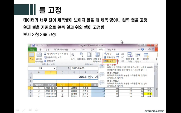 엑셀 작업을 할 때 페이지가 넘어가도 고정된 행과 열을 계속 보고 싶다면 틀 고정을 설정하자. 메뉴 가운데 창에서 틀 고정을 클릭하면 지정된 셀의 좌측 상단을 기준으로 틀이 고정된다. 이 방법은 고정된 틀의 페이지를 참고해 자료를 만들 때 유용하게 사용할 수 있어 많이 이용되고 있는 엑셀 활용 팁이다.