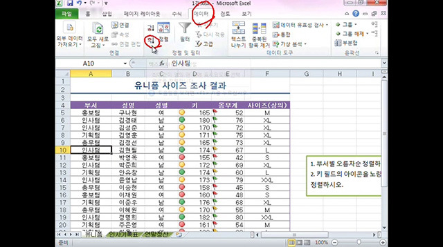 오름차순이나 내림차순으로 데이터를 정리할 때 꼭 필요한 팁이니 외우도록 하자. 한가지 필드로만 정렬할 경우 원하는 필드 영역의 셀을 클릭한 다음 엑셀 프로그램 화면 상단에 있는 ‘데이터’에서 오름차순 또는 내림차순 정렬을 클릭하면 된다. 두 가지 이상의 필드로 정렬을 원할 때에는 해당 범위를 드래그해서 설정하거나 영역의 아무 셀이나 클릭해 마찬가지로 ‘데이터’에서 정렬하기를 클릭하면 된다. 정렬기준에는 열과 정렬기준 / 정렬기준 / 정렬 이렇게 3가지를 설정할 수 있도록 나온다.