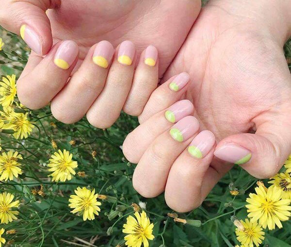 계절을 담은 듯한 싱그러운 느낌의 디자인. 이런 싱그러운 분위기가 잘 표현될 수 있도록 네일 보디는 연한 베이비 핑크 베이스로 은은하게 표현했고, 상큼한 레몬 컬러와 라임 컬러를 이용해 루눌라 부분에 포인트를 줬다. 루눌라 부분을 좀 더 볼드하게 칠하고 톡톡 튀는 컬러를 사용하다 보니 컬러 그 자체만으로도 충분히 포인트가 되는 느낌이다.