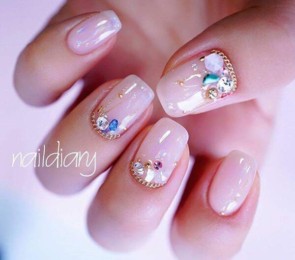 루눌라 부분에 무조건 컬러만 입힐 필요는 없다. 사진처럼 다양한 디테일을 더해 색다른 분위기를 만들어 낼 수 있기 때문. 큐티클 부분에는 골드 체인으로 엔틱한 느낌을 더 했고 반짝반짝 빛나는 매력을 지닌 스와로브스키 스톤과 맑고 투명한 느낌의 컬러 파츠를 이용해 한층 고급스러운 느낌으로 업그레이드 했다. 골드참과 와이어를 이용해 디테일한 부분까지 꼼꼼하게 신경 쓴 흔적도 엿보인다.