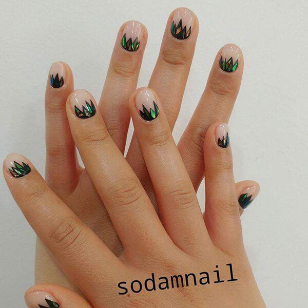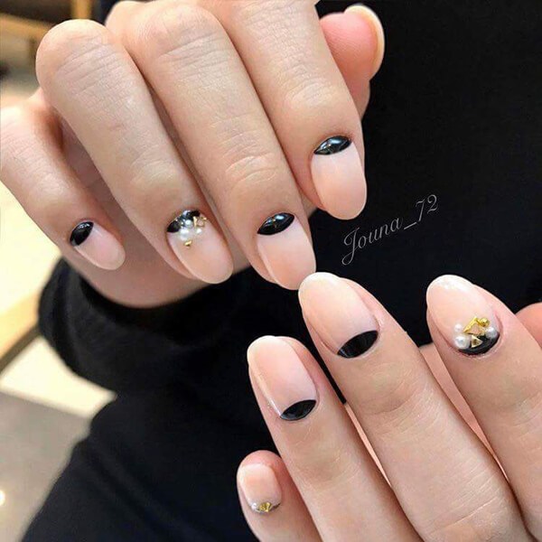 블랙 컬러는 어떤 코디에도 잘 어울리고 시크한 무드를 완성하는 데 효과적이라 많이 사용된다. 이 디자인에서는 페일한 피치핑크를 이용해 풀코트로 바르고 루눌라 부분에 블랙 컬러를 매치했다. 그러다 보니 블랙 컬러가 연한 바탕 위에서 더욱 강조되어 보이는 듯한 느낌이다. 포인트로 진주와 골드 파츠를 올려 좀 더 블링블링한 느낌을 더했다.
