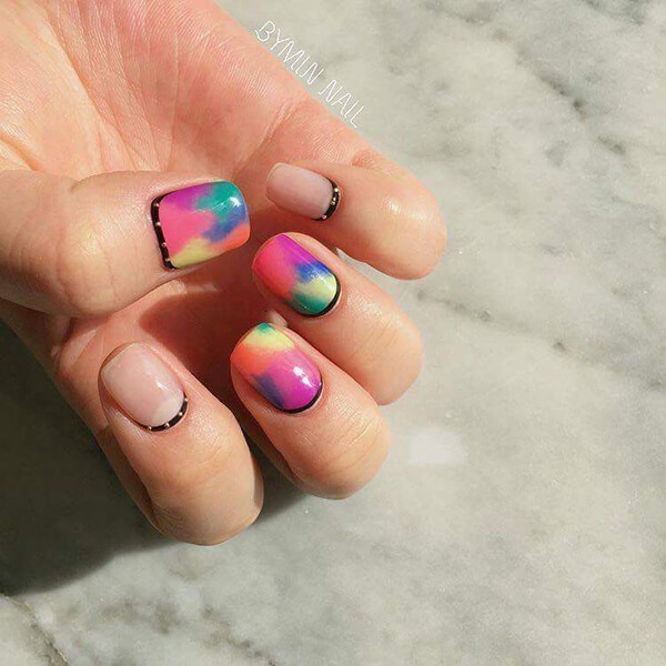 파스텔 무지개 톤을 담아 마블링 테크닉으로 표현해 포인트를 준 디자인. 루눌라를 크게 강조하기 보다는 블랙 컬러로 가늘고 엣지있게 라인만 그려내어 전체적으로 가벼운 느낌과 함께 무지개 컬러를 안정적으로 감싸 안은 듯한 느낌이다. 가늘게 그린 루눌라 부분에는 골드 볼 참을 일정한 간격으로 붙여 세련미도 잃지 않았다.