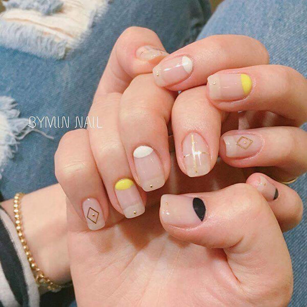전체적으로 깔끔한 느낌이 나게끔 기본적으로 시스루 디자인을 했다. 루눌라 부분은 옐로우, 블랙, 화이트를 적절히 가미해 포인트가 되면서도 눈에 확 띄게 했다. 옐로우와 블랙의 대비 효과로 인해 청순한 디자인에 숨결을 불어넣은 셈. 루눌라 부분을 표현하지 않은 네일 보디에는 골드 볼참과 골드 다이아 플랫파츠를 더해 고급스러우면서도 심플한 느낌을 더했다.