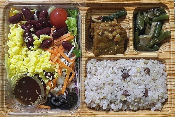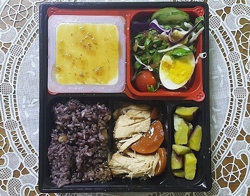 연두부와 샐러드를 뺀 나머지를 전자레인지에 1분 30초 정도 돌렸다. 잡곡밥 냄새와 닭 가슴살 조림 냄새가 한데 어우러진 고소하고도 달달한 냄새가 살짝 올라왔다. 연두부 밑에 있던 오리엔탈 소스로 연두부와 샐러드에 뿌려주니 비주얼이 +5 상승했다.
