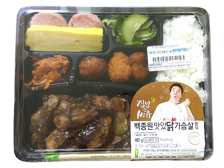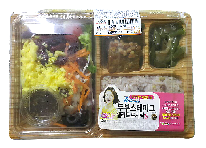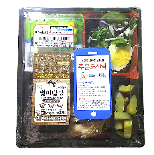 세븐일레븐 도시락 예약은 CU와 마찬가지로 직접 지점에 찾아가 예약을 하면 된다. 2일 정도 걸려서 받은 이 도시락은 전용 랩에 싸여져 있었다. 랩을 벗기면 젓가락이 떨어질 줄 알고 손으로 잡고 있었는데 웬걸,젓가락을 테이프로 고정시켜 놓은 작은 센스에 감동받았다. 중량 401g에 칼로리 515kcal인 이 도시락은 샐러드가 반이나 차지하고 있어 누가 봐도 다이어트가 목적인 이들을 위한 도시락임을 한눈에 알 수 있다. ‘한국영양학회 공동 개발’이라 쓰여 있어 왠지 맛이 없을 것 같았는데 맛에서 반전이 있었다. 전체적인 총평을 해보자면, 아이유가 나오는 과일주 CF 멘트가 딱 떠오른다. “너무 맛이써헝~”