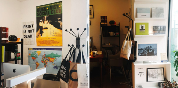 가게에 들어서자마자 보인 것은 가게 가운데에 위치한 넓고 낮은 목재 테이블 위에 놓인 사진집들이다. 이테이블 위에는 각기 다른 크기에 개성 있는 표지의 책들이 자신의 자리를 지키고 있었다. 내부를 정면에서 바라보는 기준으로 오른쪽 벽면에는 어느 한 사진집 속 사진들이 모니터에서 슬라이드 형식으로 보여지고 있었고, 왼쪽 벽면에는 이곳을 다녀간 사람들의 필체가 담긴 코멘트들과 사진들이 꽂혀있고, 북토크 행사 소식이 적혀있었다.
