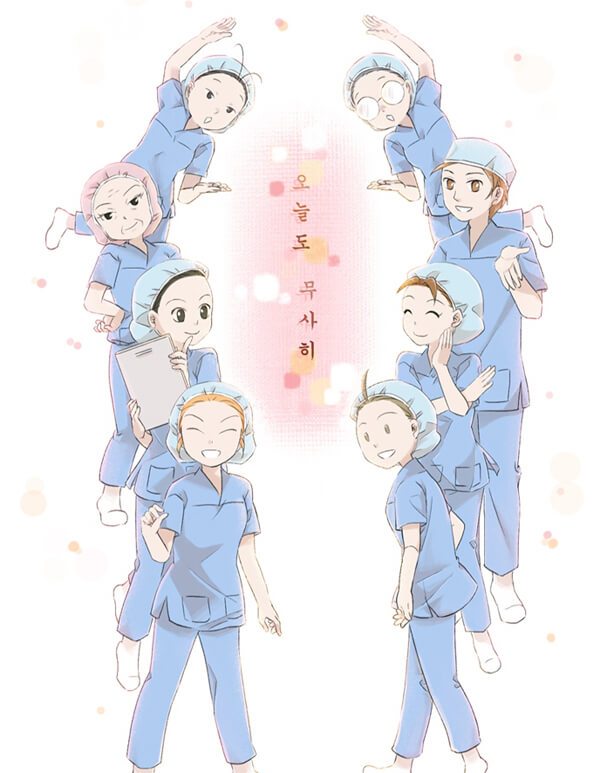 간호학과를 다니고 있는 학생이거나 아직 신입 간호사라면 꼭 읽어보면 좋을 듯한 웹툰이다. 간호사라는 직업을 갖고 있었던 leehhyo 작가가 생동감 있게 간호사의 이야기를 그려냈다. 오늘도 무사히라는 제목처럼 수술실 안에서 벌어지는 긴장감 넘치는 에피소드를 따뜻한 그림체로 담아냈다. 여느 웹툰과 달리 주인공의 이름이 따로 있지는 않다. 평간호사, 책임 간호사, 수간호사 등 직급을 이용해서만 내용이 전개되는데 간호사에게 꼭 필요한 정보도 전달하면서 수술실을 방문한 환자들과 그의 가족들까지 두루두루 감싸는 간호사들의 따뜻한 마음씨도 엿볼 수 있다.