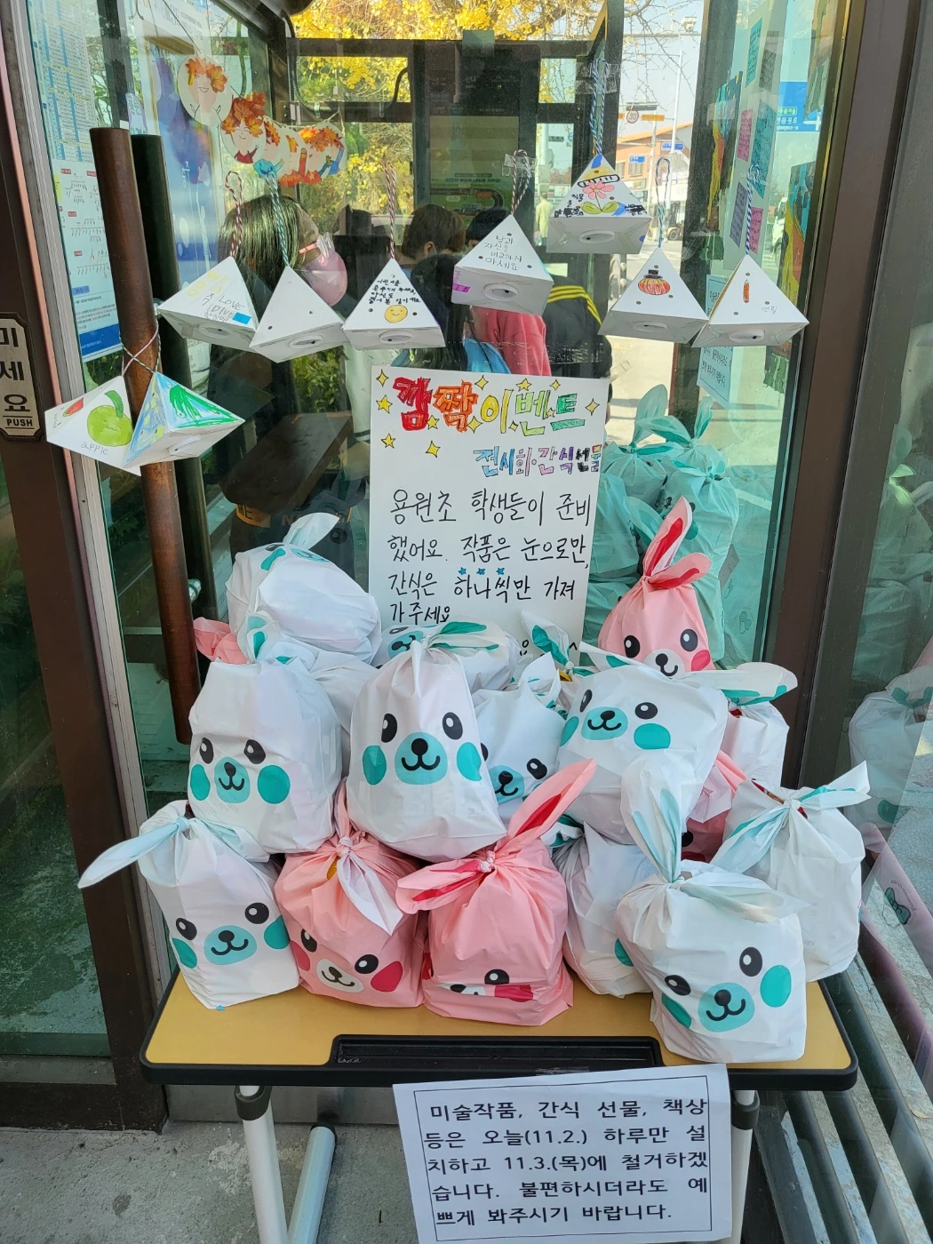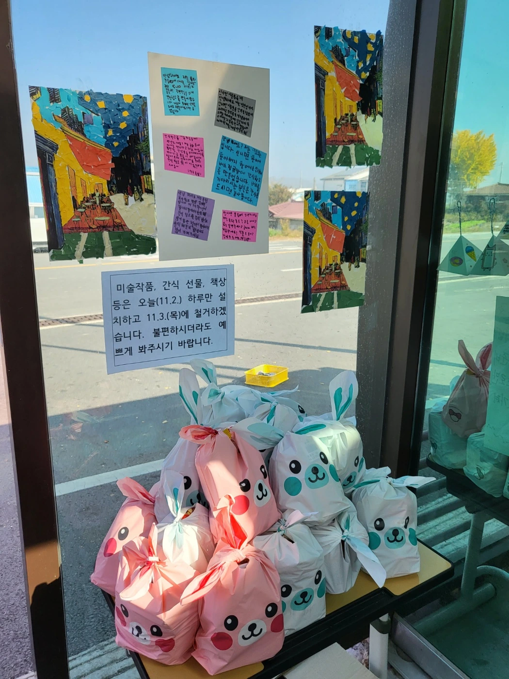 회의가 끝나고 아이디어를 한 번만 더 설명해도 될지 여쭤봤다. 부장님은 수락하셨고, 앉은자리에서 나의 계획을 처음부터 끝까지 들으셨다. 그리고 고개를 끄덕이셨다. 그렇게 우리는 연구학교 공개수업으로 학교 앞 버스 정류장을 아이들의 미술작품과 간식선물로 꾸미는 '버스 정류장 전시회' 활동을 했다.