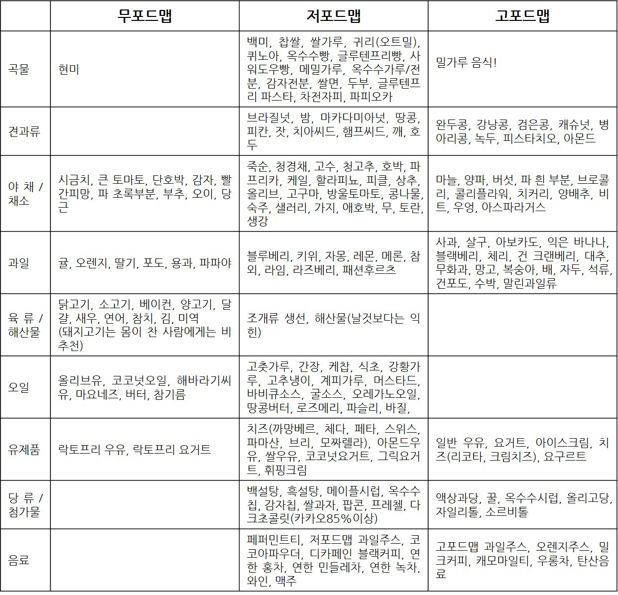 특정 당 성분으로 포드맵을 이해하긴 너무 어렵고, 일상생활에서 쉽게 접하고 먹을 수 있는 음식들로 포드맵을 구분해 나갔다. 직접 손으로 쓰면서 정리를 해보니까 얼추 머릿속에 입력이 되더라. 단 며칠 만에, 식탁에 올라와 있는 음식들을 보고도 무엇이 저포드맵인지 가려낼 수 있는 수준이 됐다. 자랑이 아니라 저주받은 기억력을 가지고 있는 나도 해냈으니, 누구나 할 수 있다는 얘길 하고 싶은 거다.