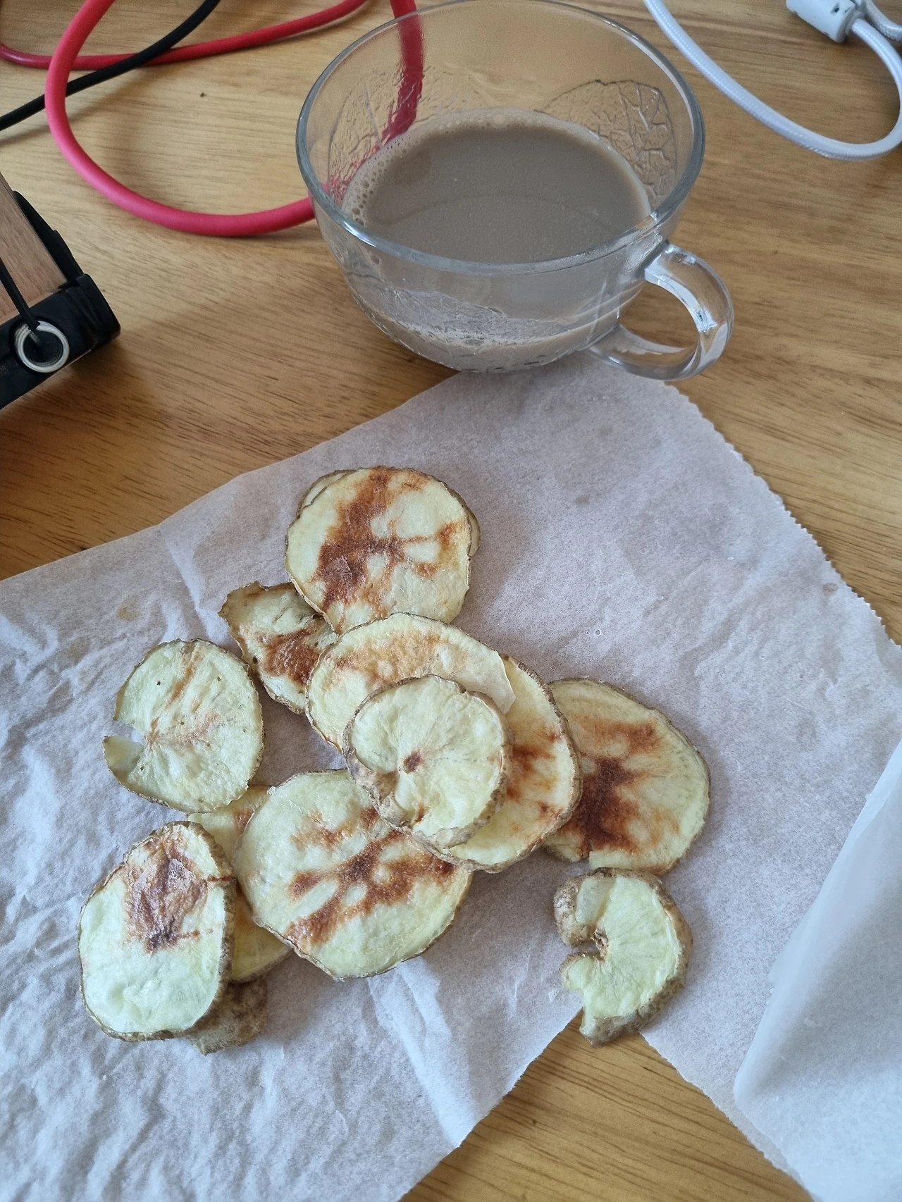 감자칩을 사먹는 대신 감자를 얇게 썰어 전자레인지에 바싹 익히면 훌륭한 간식이 됩니다. 오일을 바르지 않아도 바삭해집니다.