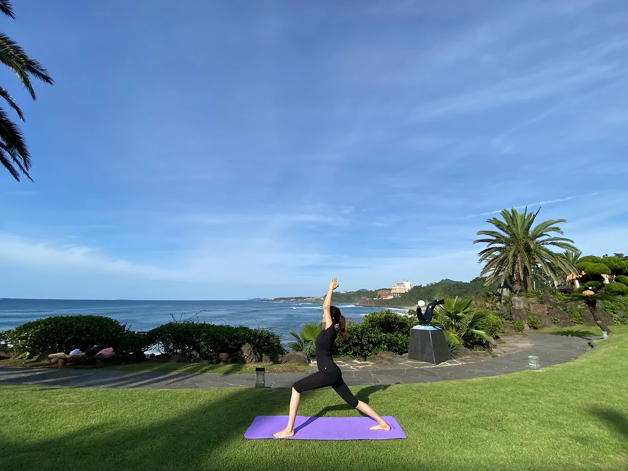그래서 얼마 전 제주도 여행을 갔을 때 요가 클래스를 일정에 넣었다. 새벽 일곱 시 반에 시작하는 일명 '새벽 요가'. 새벽의 서늘한 공기와 떠오르는 해를 마주하며 즐기는 운동이라니, 게다가 바다를 보면서 하는 야외 클래스라 생각만 해도 황홀했다. 내가 머무는 숙소에서 멀리 떨어진 곳이라 새벽 6시부터 일어나 부지런 떨어야 했지만, 푸른 바다를 바라보며 즐기는 요가는 말로 표현할 수 없을 만큼 벅찬 감동이었다. 끝날 무렵엔 본격적으로 제주도의 강한 햇빛이 쏟아져 내리며 땀을 뻘뻘 흘리다 못해 타들어가는 줄 알았지만