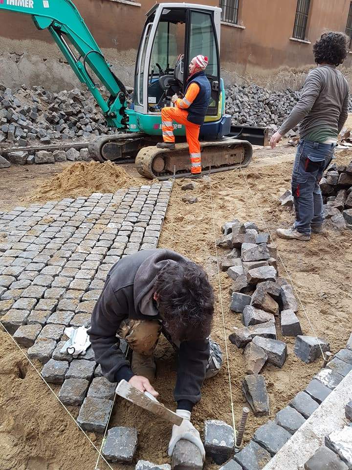 생각보다는 깊게 들어가지는 않는다. 16세기에 바티칸 베드로 성당 마당에 가장 처음 깔려서 sanpietrini (또는 sampietrini) 라는 이름이 붙여졌다고. 그전에 사용하던 벽돌보다 월등히 마차 및 말굽에 대한 내성이 강하고 돌과 돌 사이의 공간이 확보되면서 전체적인 길의 안정성 유지에도 좋아서 그 뒤로 로마 전체에 급격히 퍼졌다고 한다. 게다가 지진 화산 많은 이탈리아에 쌔고 쌘 검은 현무암 (basalt)으로 만드니 재료도 풍부.