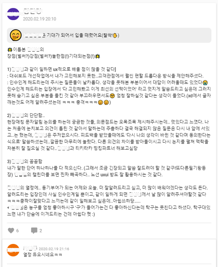 "다른 팀원들이 뭐 하는지 궁금, 내가 왜 이렇게밖에 할 수 없었는지 미안함 표현, 유일한 칭찬 가능 툴", "마니또같은 느낌, 서로를 동기 부여 해 주기 위함", "오해가 풀림, 기획자나 개발자가 하는 생각을 데일리체크인이 아니었으면 몰랐을 것 같음"
