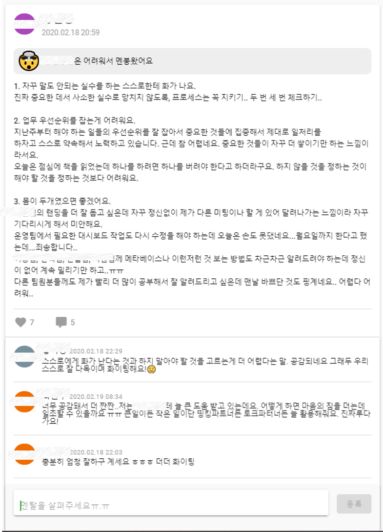 팀이 커지고 Silo가 생기면서 사람들은 다른 사람들은 어떻게 하루를 보내는지 알기가 어려웠어요. 또, 업무 상에서는 이야기하지 못했던 진짜 속마음과 이야기를 얘기하고 싶다는 니즈가 있었어요.
