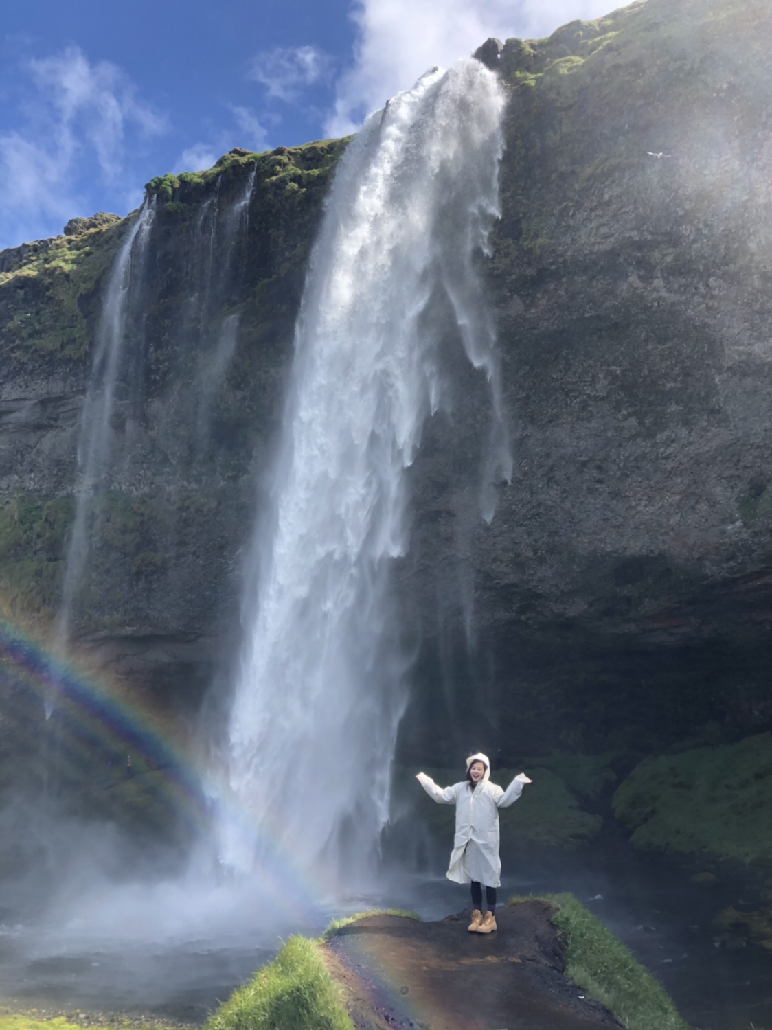 (Seljalandfoss)로 발길을 돌렸다. 한 시간 남짓 운전했을까. 저 멀리 뻥 뚫린 시야에 시원한 물줄기가 들어오고, 안으로 걸어 들어가니 폭포 비가 쏟아져 그 광대함을 실감케 한다. (이 곳에서 우비는 필수다!) 용기를 내어 폭포 안으로 근접해 가니 무지개가 영롱하게 우릴 비춰주었다.