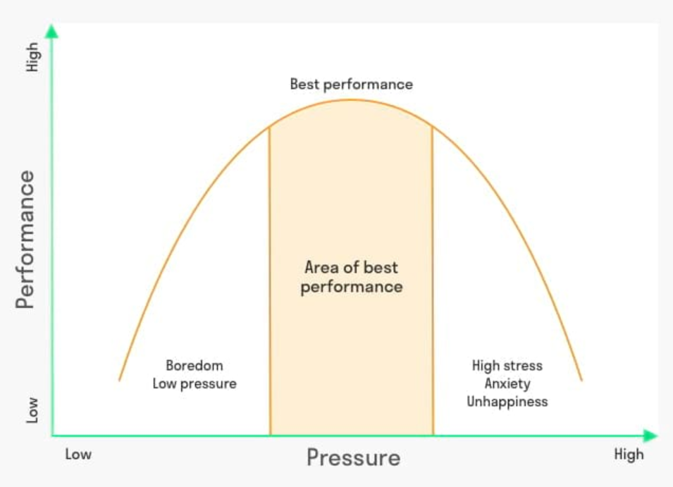 스트레스가 너무 없는 상태에서는 performance를 낼 수 없습니다. 스트레스가 없는게 꼭 좋은건 아니라는 의미입니다. 업무에 대한 압박감, 공부에 대한 스트레스, 성취에 대한 중압감이 있기에 어느 정도의 성과를