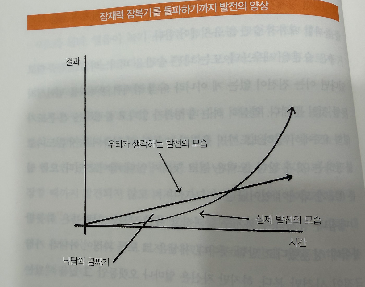"아주 작은 습관의 힘"이라는 책에 나오는 그래프이다. 아마도 "낙담의 골짜기"에서 생각만큼 성과가 나오지 않자, 그만둘 이유를 열심히 찾아내고 설명하는 것이리라. 우리가 생각하는 발전의 모습은 열심히 하면 당장 성장이 보일 것 같지만 현실은 그렇지 않다. 한참의 기간을 버텨내야 우리가 도달하는 목표에 갈 수 있다.