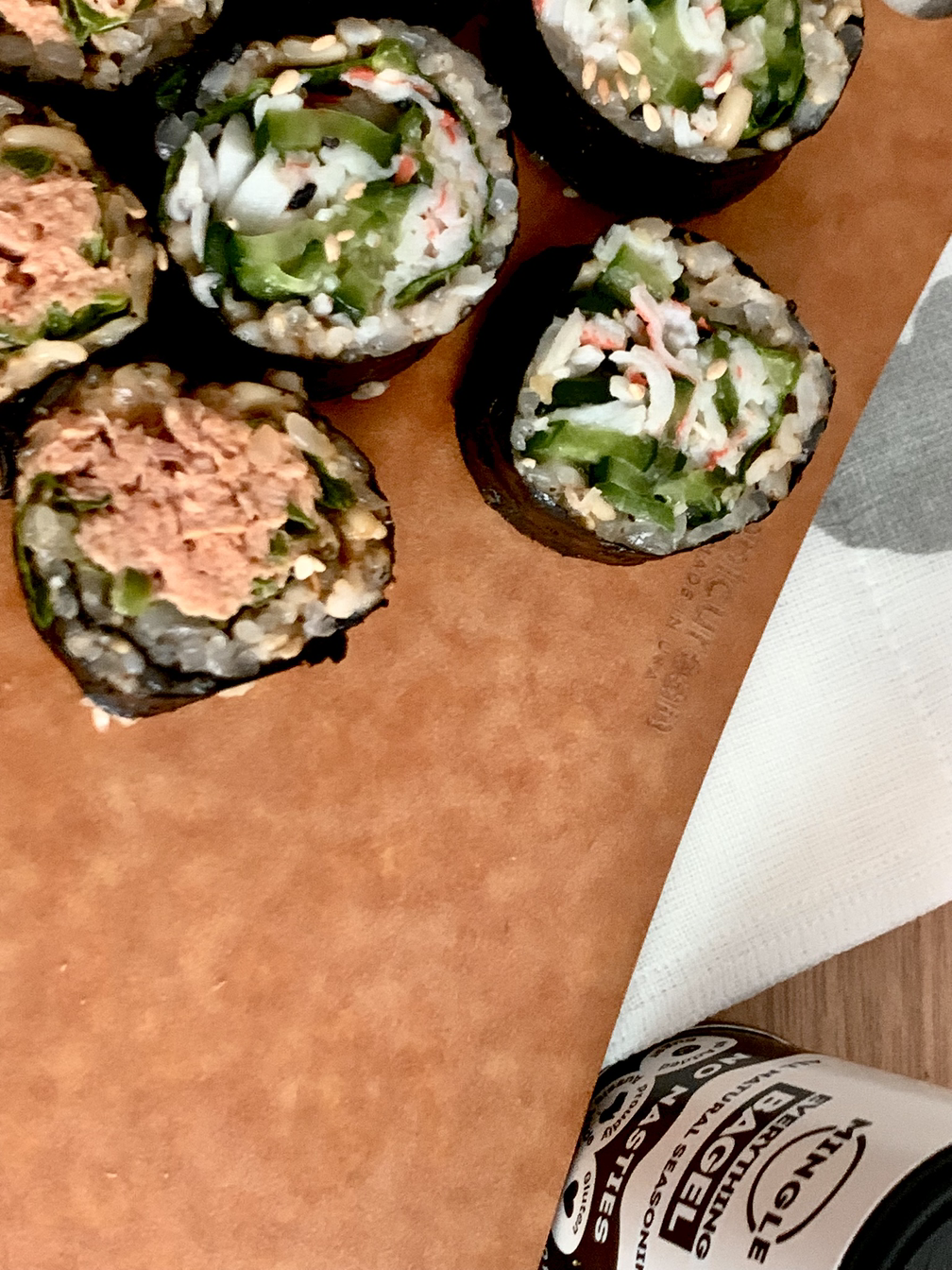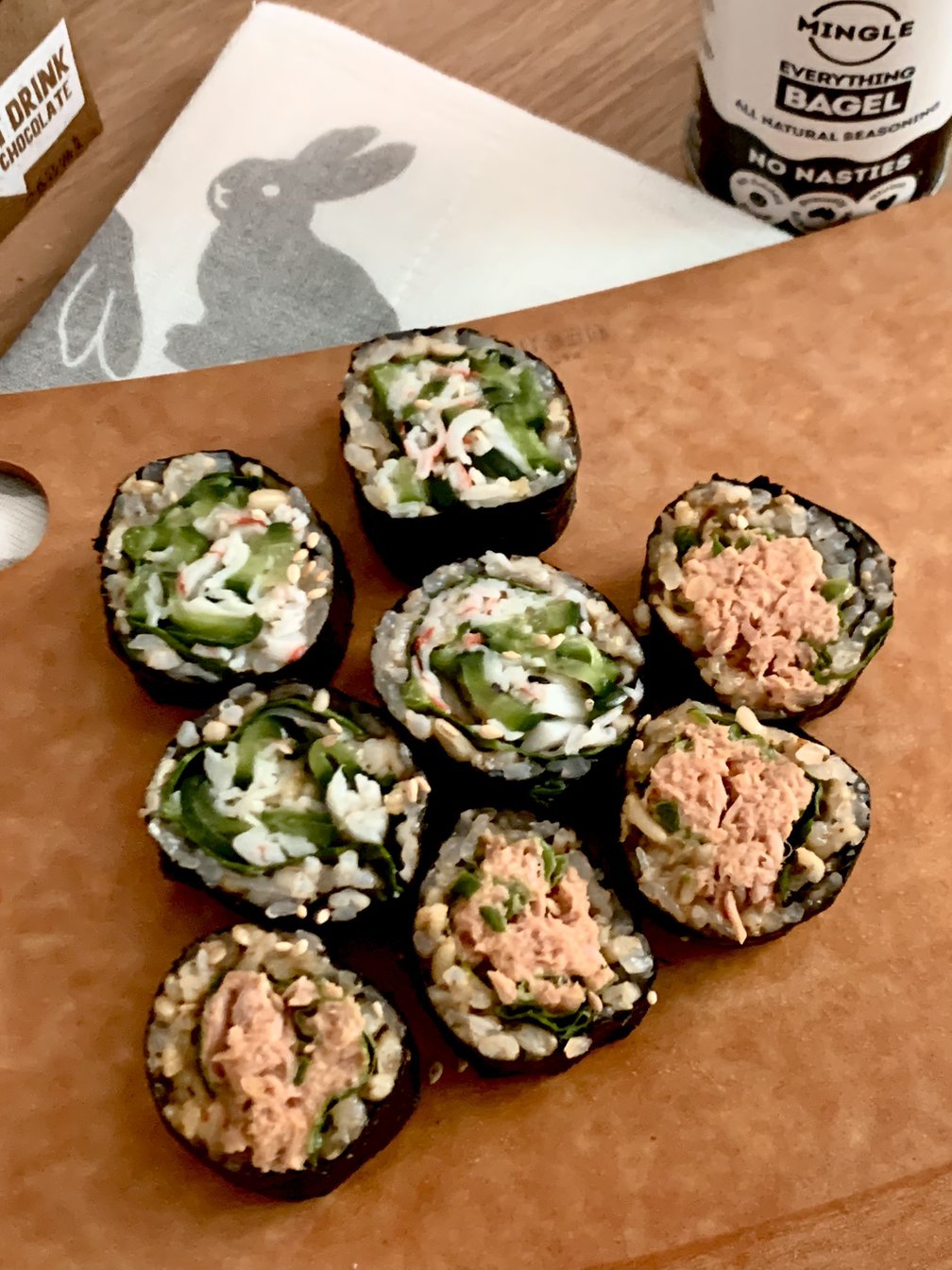 와사비 오이 크래미 김밥과 스리라차 참치 꽈리고추 김밥. 햇반 현미귀리곤약밥 1개 뜯으면 두 줄 나온다. 자르면서 김밥이 계속 뭉개져서 모양은 개떡 같지만 맛은 완벽했다.