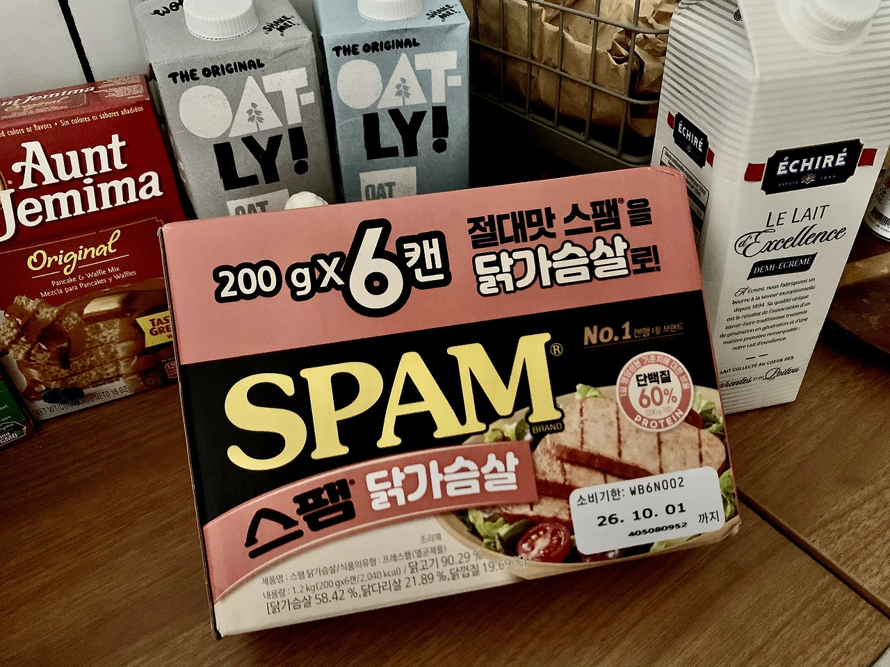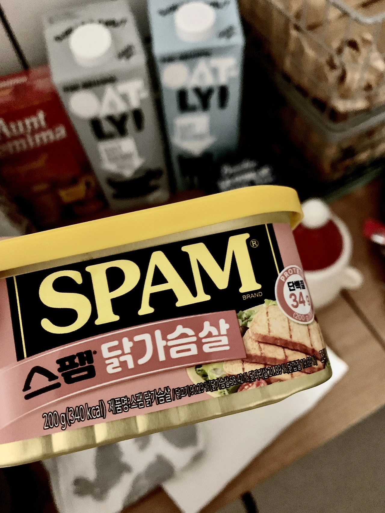 늘 궁금했던 스팸 닭가슴살. 컬리 굶겼다가 받은 쿠폰으로 한 개 사봤는데 맛이 나쁘지 않았다. 당도 1g이라 식단 중에 스팸 못 참겠다 싶을 때 입 막으면 될 것 같다.