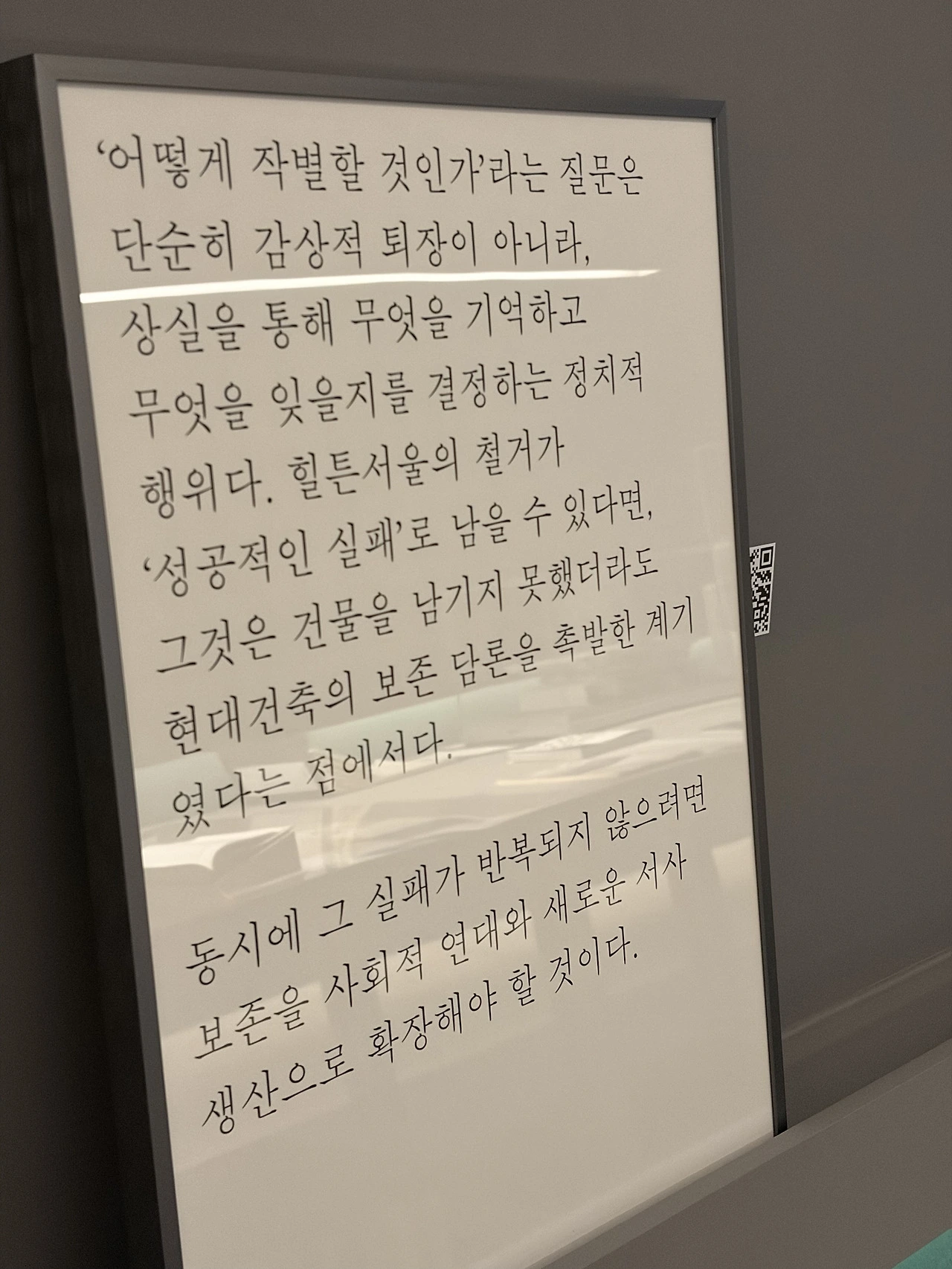현대카드로 현장결제 시 할인받을 수 있어서 따로 예약은 안 하고 방문했다. 나는 서울 힐튼 호텔에 묵어본 적은 없어서 투숙객들처럼 무언가 추억할 거리는 없지만 존재했다가 사라져 버리는 게 어떤 공허함인지 알고 있고, 또 그 시기를 지나가고 있는 중이라 그런지 전시가 꽤나 궁금했다.